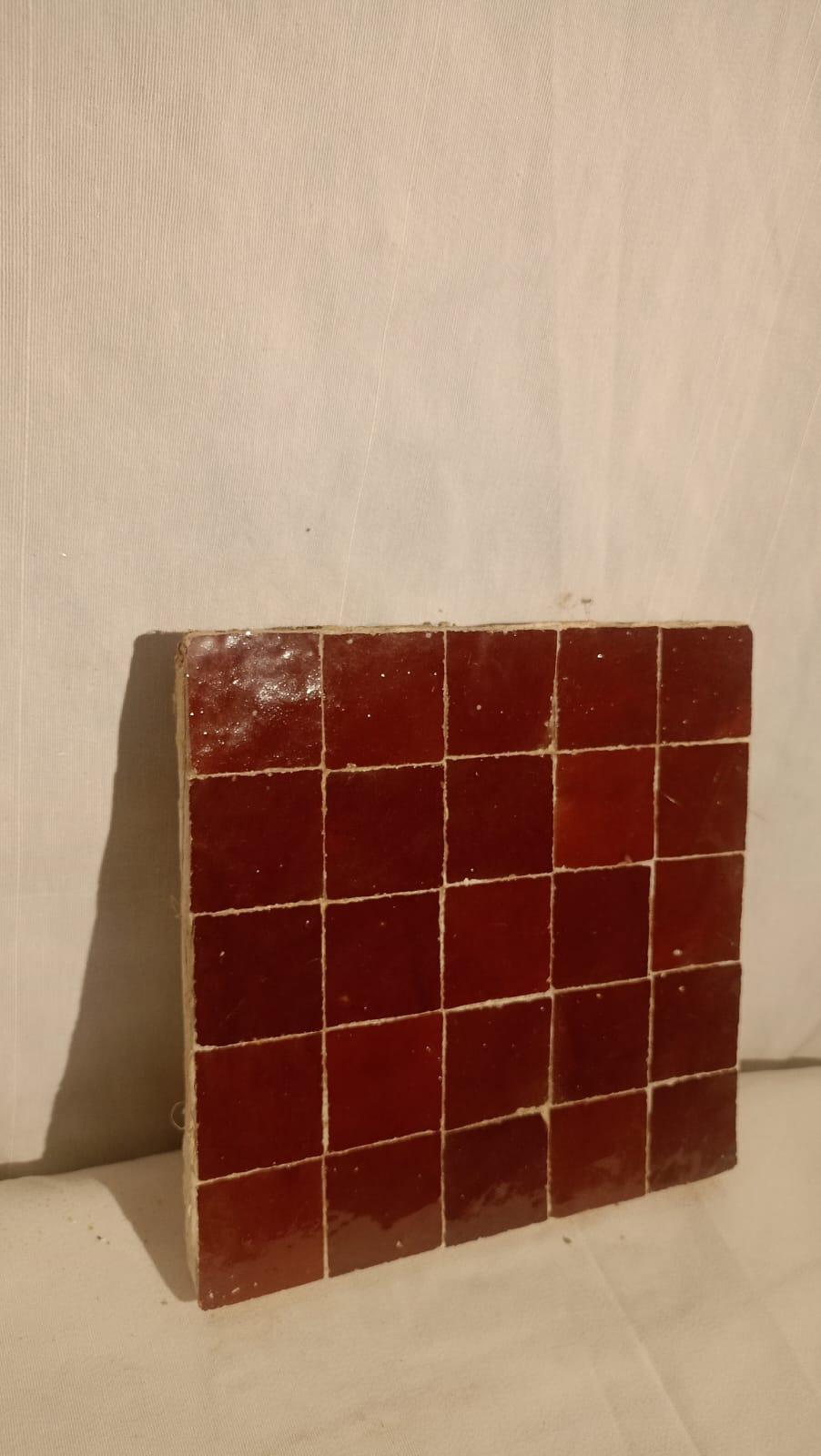 A red traditional Moroccan zellige is a striking example of Moroccan craftsmanship. This type of tile is made from terracotta clay and glazed with a deep, vibrant red finish. The shade of red can range from earthy tones, reminiscent of Moroccan spices and desert landscapes, to more intense, jewel-like crimson hues. The red glaze often has a slight natural variation due to the handmade process, giving the tiles a dynamic, organic feel.
