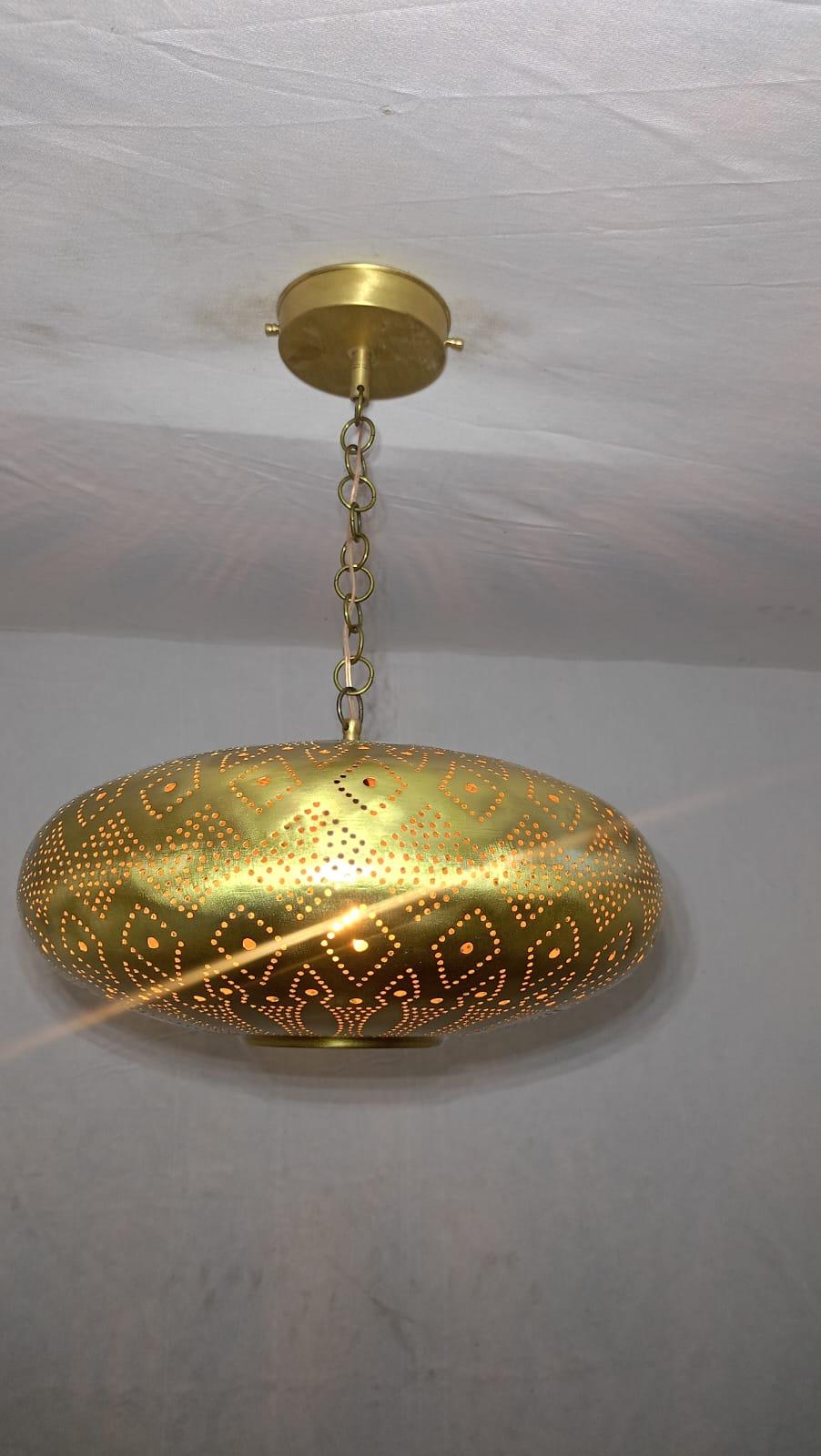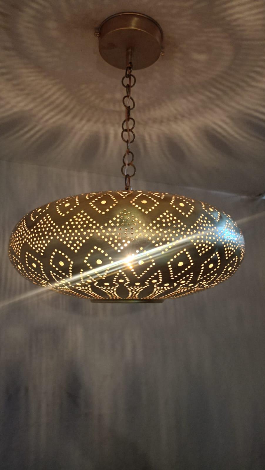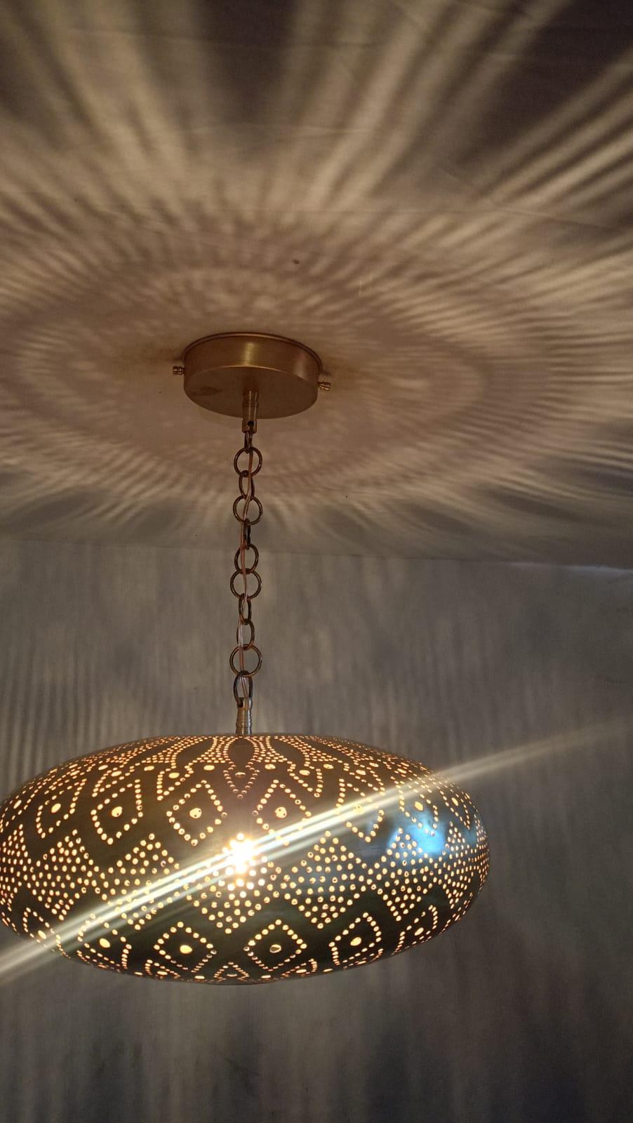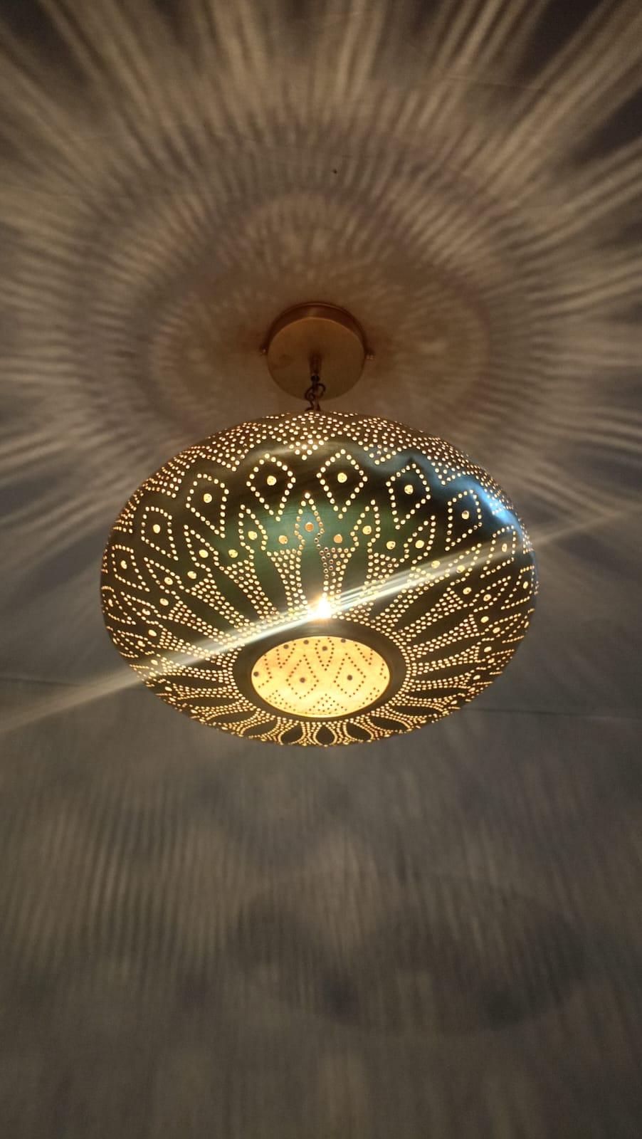 The traditional Moroccan round brass lamp is a unique artistic piece characterized by its circular design and intricate decorations. It is usually made of yellow brass or bronze and features finely detailed engravings on its surface, reflecting high traditional Moroccan craftsmanship. These patterns may include geometric shapes, floral motifs, or Arabic designs. This type of lamp provides a warm and elegant light that emanates through small openings in the metal, creating beautiful light and shadow effects. These lamps are often used as interior decorations in homes or in Moroccan-style hotels and restaurants to add authenticity and a traditional atmosphere.