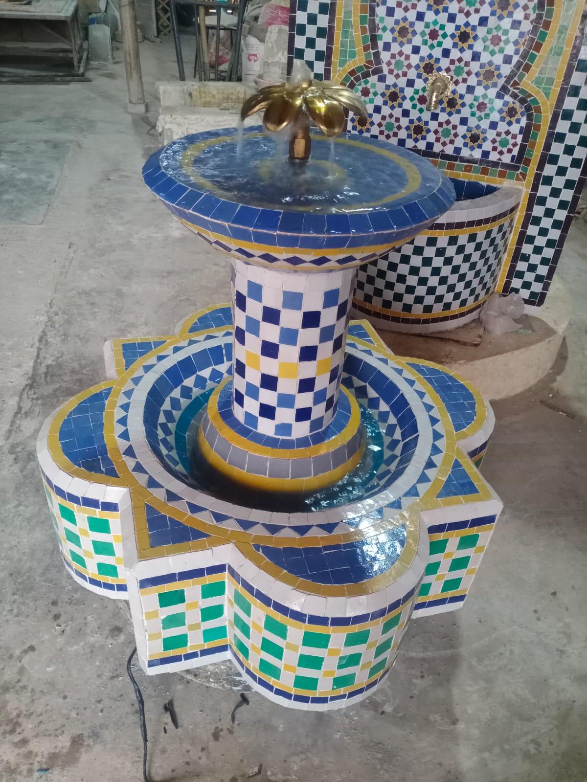 Bring the serene beauty of Moroccan design into your space with this handcrafted Zellige fountain. Featuring intricate geometric patterns made from hand-cut tiles, this fountain is a stunning example of traditional Moroccan craftsmanship. Its soothing water flow and vibrant design make it a perfect centerpiece for gardens, courtyards, or interior spaces.